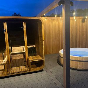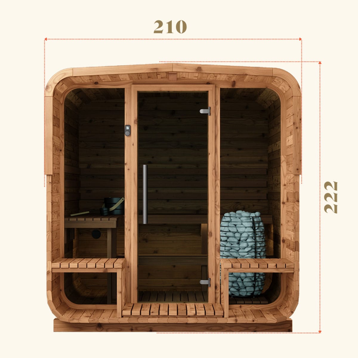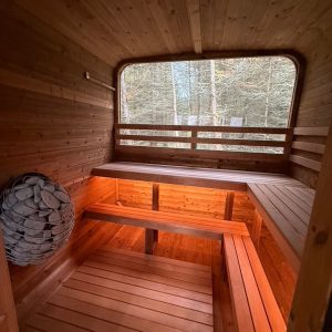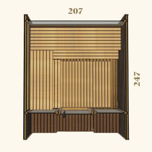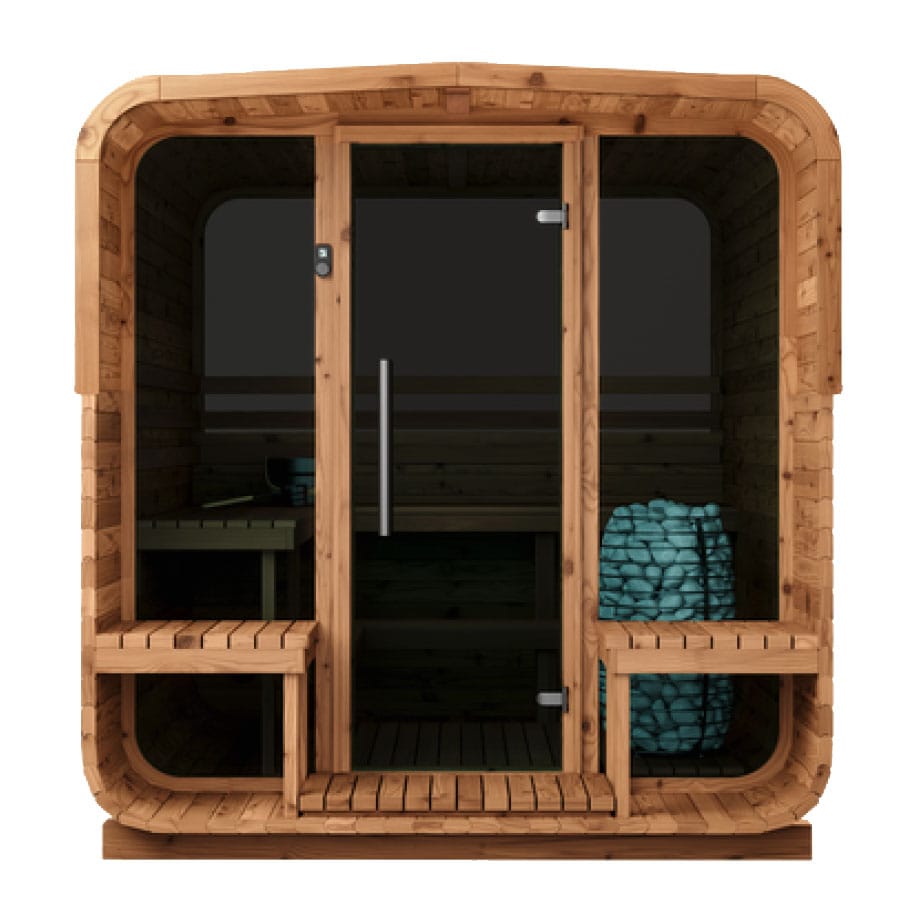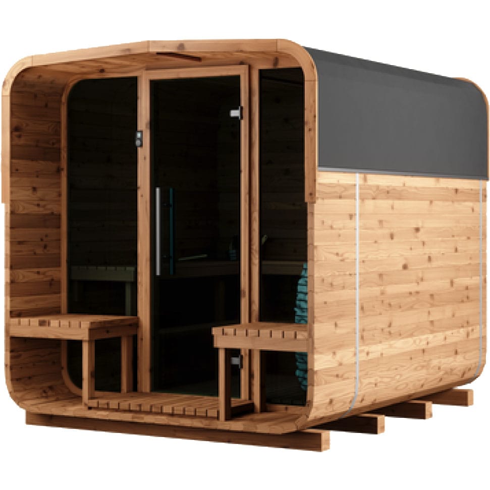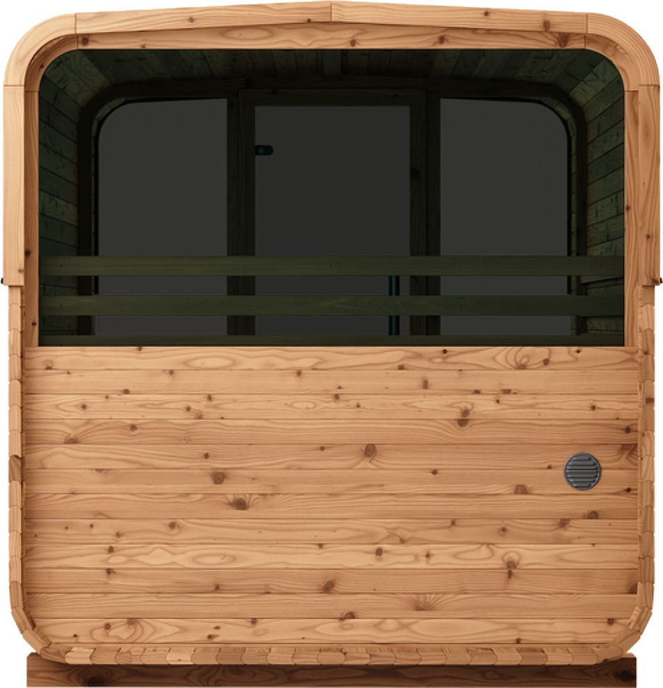 The Aura’s standout feature is its welcoming porch with built-in benches—a perfect retreat for relaxation before or after your sauna session. This additional space adds a touch of elegance and functionality, making the Aura not just a sauna but a lifestyle enhancement.